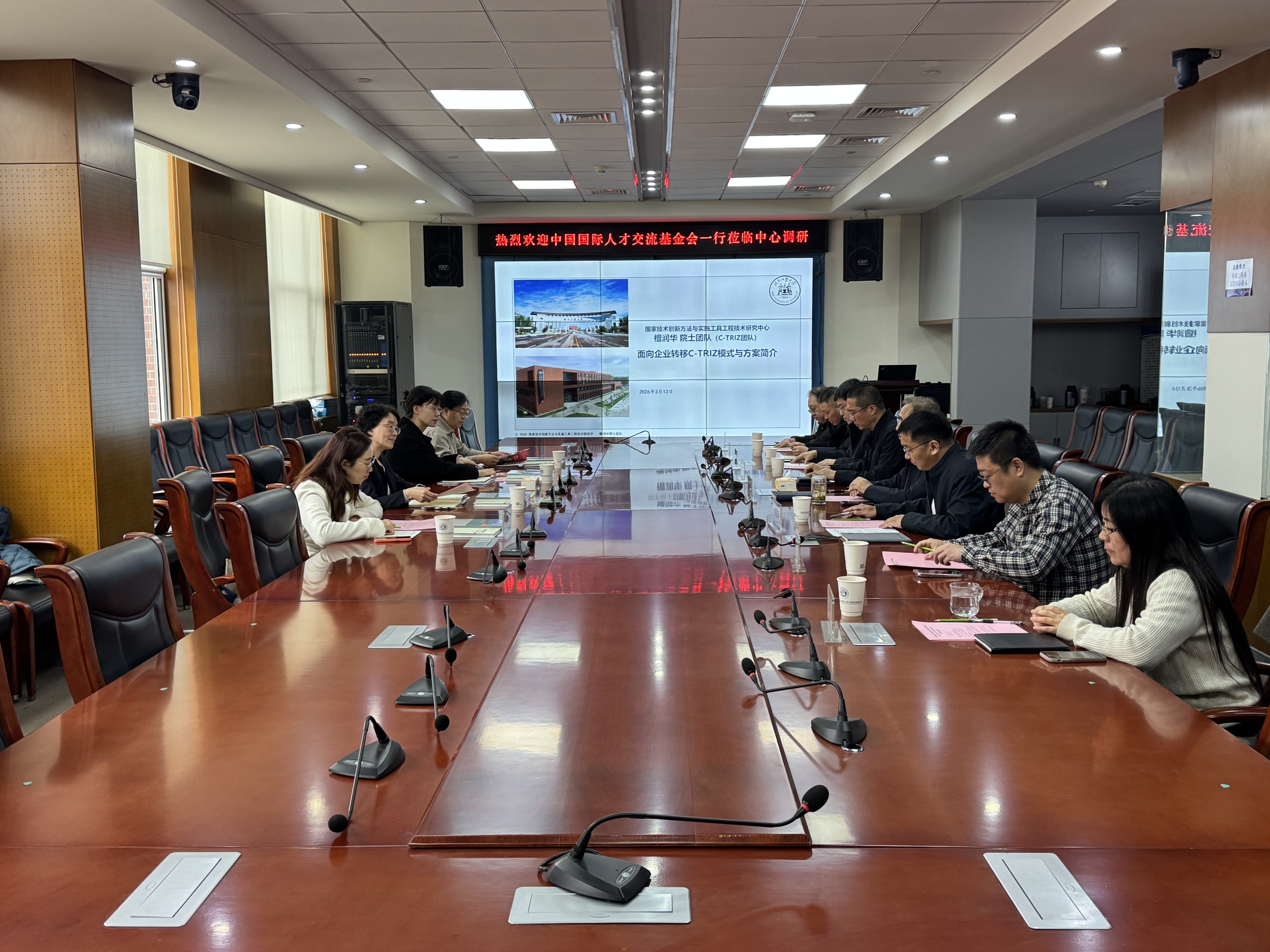 3月13日上午,中国国际人才交流基金会(以下简称基金会)副主任杨颖琳一行到中心调研,创新方法研究会(以下简称研究会)办公室主任姜洋全程陪同。中心终身名誉主任、河北工业大学原副校长、研究会副理事长檀润华教授、中心主任曹国忠、副主任杨伯军及中心研究团队成员陪同并参加座谈会。